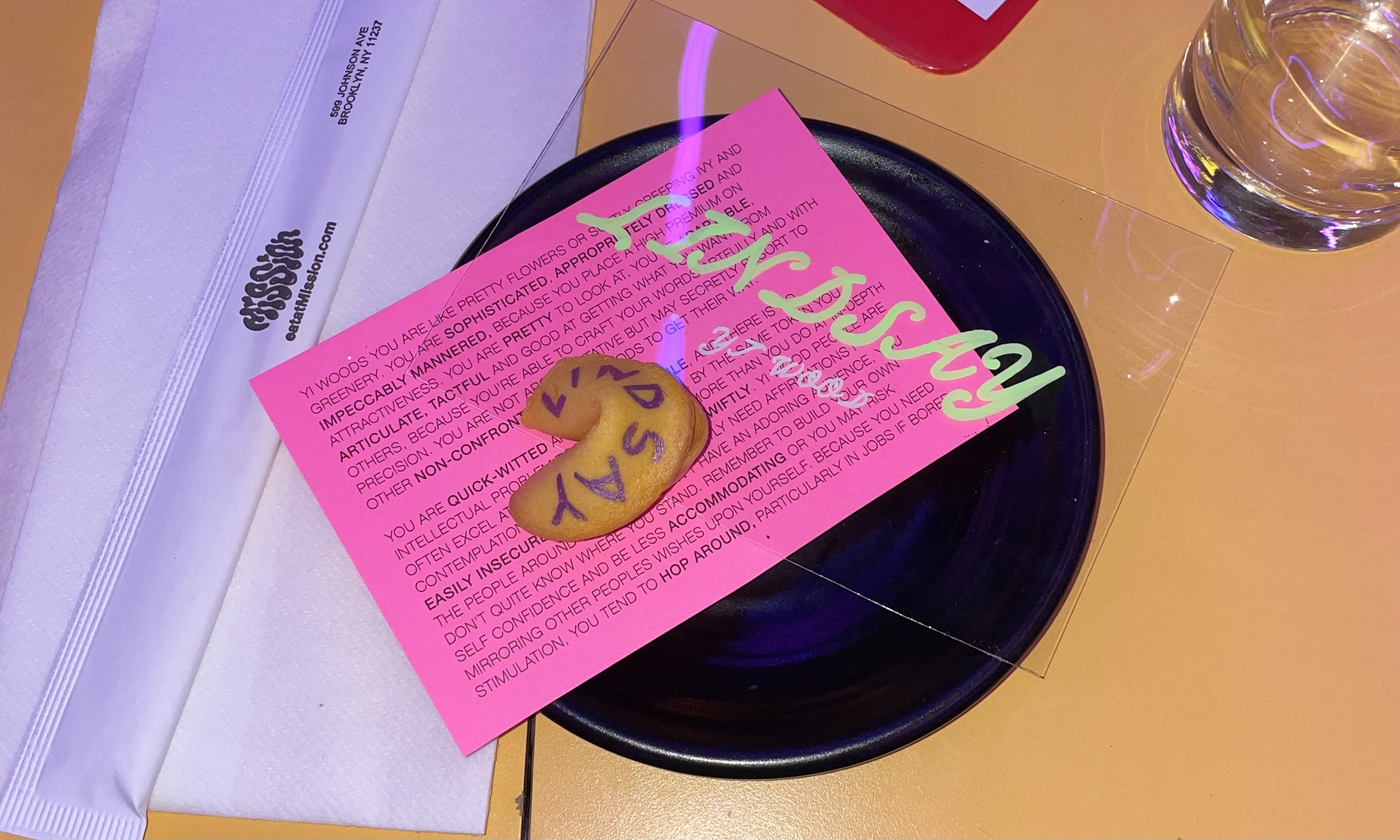 The dinner was held at Mission Chinese in Bushwick which took Chinese food into the future, with neon lighting shiftng colors by the second, shiny metal tables, elementary school chairs. It transported you to a modern day fortune teller shop.